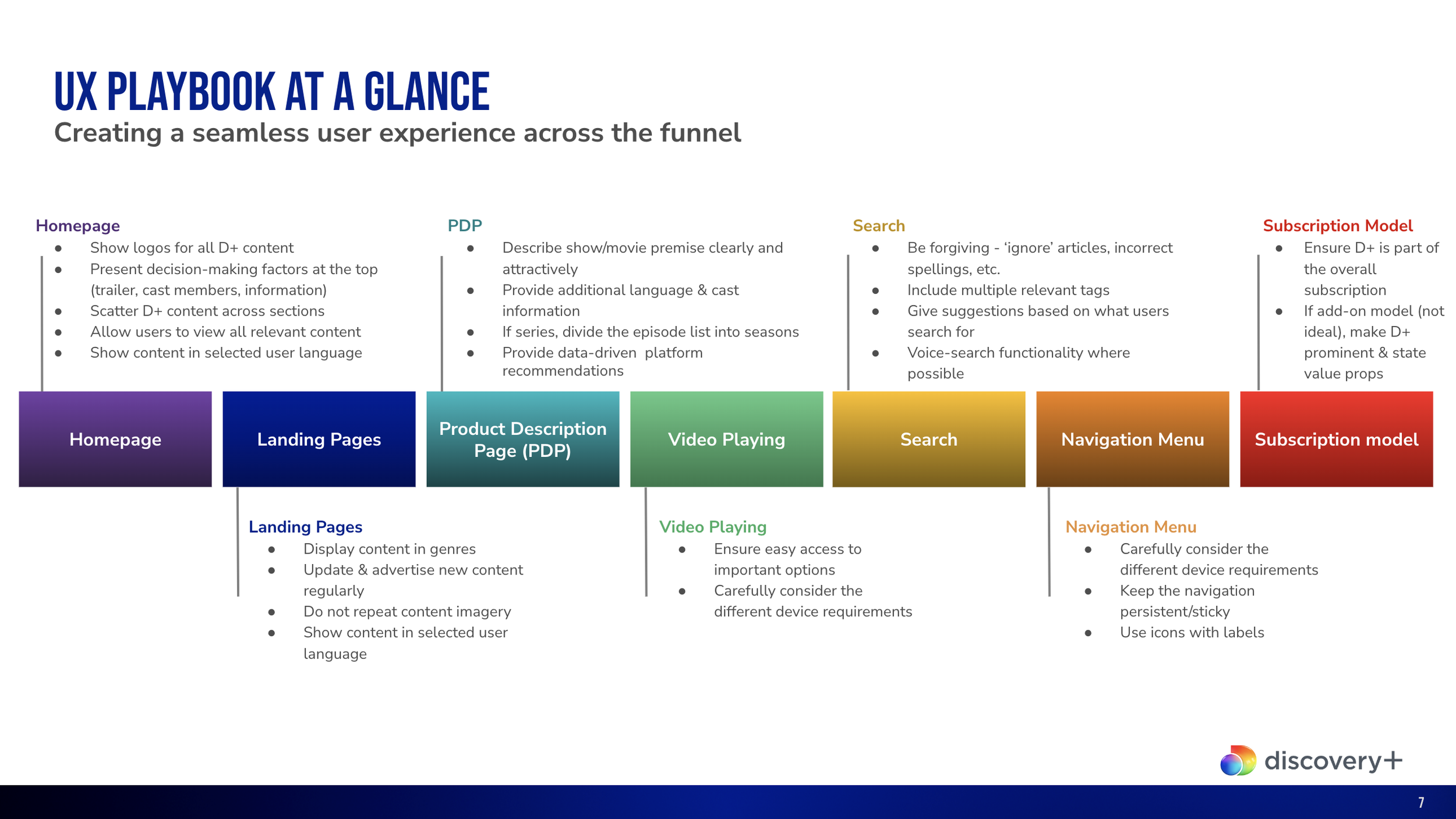 Once completing the research & presenting the results to both Discovery+ and each of the partner platforms, it was time to create the UX playbook! Using Discovery+’s brand guidelines & templates, I created a complete deck of best practices for streaming platforms in general, but also as a specific guide for how to place Discovery+ content within the platform.